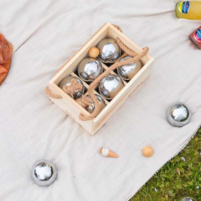 This original set of boules comes in a handy hardwood carry crate and comprises of six polished steel boules, two wooden cachonets (varnished) and measuring string with plastic toggle. The six boules are designed with one of three distinct patterns where each player has two boules of the same pattern. Boules by Planet Finska also comes with easy to follow rules of the game.